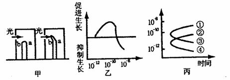35.甲图表示燕麦胚芽鞘在单侧光照下的生长情况,乙图表示胚芽鞘对不同浓度生长素的不 同反应,则丙图中表示a、b二点生长素浓度变化的曲线应分别依次是 ( )