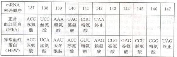 5.分析下表可知,正常血红蛋白(HbA)变成异常血红蛋白(Hbw),是由于对应的基因片段中