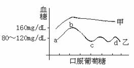 36.在正常进餐后4小时测定甲乙两人的血糖浓度,甲为160 mg/dL,乙为80~120 mg/dL,然后甲乙分别口服100克葡萄糖,每隔半小时测定一次血糖浓度,其实验结果如图所示,据下图回答: