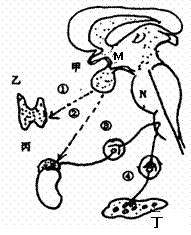 右图为人体中枢神经系统的部分结构(以M、N表示)和几种内分泌腺(以甲、乙、丙、丁表示)。据图回答: