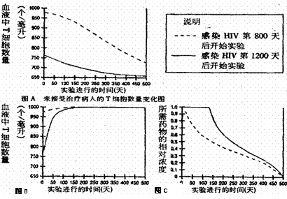 39.某科学家正在进行有关治疗艾滋病药物的研究,以找出在受到 HIV感染后,使用药物进行治疗最佳时间。经过研究获得实验结果如图A、B、C所示。