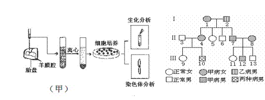 (9分)产前诊断是优生的主要措施之一,检查羊水和羊水中的胎儿脱落细胞,能反映胎儿的病理情况。羊水检查过程包括细胞培养、生化分析、基因分析、染色体分析等。甲图是羊水检查的主要过程,请据图回答: