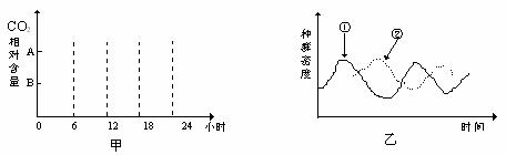 (1)在甲图内自A处画出由于大量绿藻、鱼虾、细菌的存在,使CO2 含量在水池中一昼夜里大致变化的曲线。