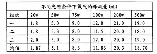 ③将6套装置放入暗室中,然后用20W、50W、75W、100W、200W和500W的台灯等距离地分别照射1- 6号装置,观察气泡的产生情况。