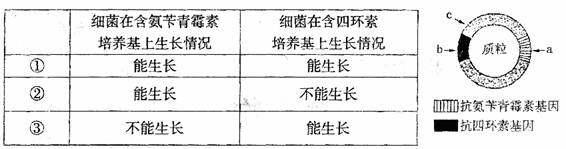 11.质粒是基因工程中最常用的运载体,它存在于许多细菌体内。质粒上有标记基因如下图所示,通过标记基因可以推知外源基因(目的基因)是否转移成功,外源基因插入的位置不同,细菌在培养基上的生长情况也不同,下表是外源基因插人位置(插入点有a、b、c),请根据表中提供的细菌生长情况,推测①、②、③三种重组后细菌的外源插入点,正确的一组是: