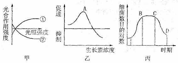 ①图甲中若曲线①表示CO2的吸收量,则曲线②可表示O2的吸收量 ②图乙中在植物向光性实验中,向光一侧生长素浓度应低于A点所对应的生长索浓度 ③图丙表示恒定容积的液体培养基中微生物群体生长曲线,处于BC段的微生物种内斗争大于CD段