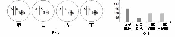 4分)豌豆豆荚的颜色绿色(A)对黄色(a)为显性,豆荚的形状饱满(B)对不饱满(b)为显性,如图1所示甲