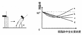 某研究小组探究避光条件下生长素浓度对燕麦胚芽鞘生长的影响。胚芽鞘去顶静置一段时间后,将含有不同浓度生长素的琼脂块分别放置在不同的去顶胚芽鞘一侧,一段时间后测量并记录弯曲度(α)。左下图为实验示意图。右下图曲线中能正确表示实验结果的是