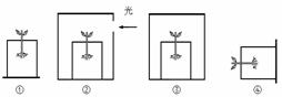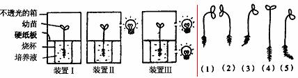 某小组研究光对同一种植物幼苗生长的影响,设计的实验装置如下图左所示。某同学预测幼苗几天后的生长可能情况如下图右。请你判断:几天后,实验装置I-Ⅲ中幼苗的正确形态依次是