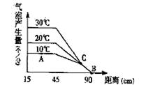 16. 某学校生物兴趣小组用伊乐藻进行光合作用的实验,将一枝伊乐藻浸在加有适宜培养液的大试管中,以白炽灯作为光源,移动白炽灯调节其与大试管的距离,分别在10℃,20℃和30℃下进行实验,观察并记录不同距离下单位时间枝条产生的气泡数目,结果如图所示。下列相关叙述不正确的是 ( D )