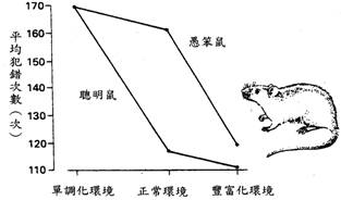 下图是经过筛选培育的“聪明鼠”与“愚笨鼠”在不同环境下长大后,跑迷宫犯错次数的差异。下列哪些叙述符合下图的內容?