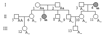 Ⅱ8的基因型是需要推测的,根据其双亲的基因型,可推知其基因型可能有两种,AA和Aa,携带致病基因的基因型是Aa,在计算其几率时,由于其表现型是正常的,就排除了aa的可能性,所以Ⅱ8个体携带致病基因的几率为2/3。解第(3)小题时,计算Ⅲ12和Ⅲ13婚配后的子代患病的几率是多少?首先要确定他们的基因型是Aa的可能性是多少?如果有一个不满足条件,即有一个基因型不是Aa,则后代就不可能有患者。计算 Ⅲ12个体基因型为Aa的几率,就要追溯到Ⅱ6个体的基因型是Aa的几率,由于已推知其双亲的基因型均是Aa。所以Ⅱ6个体的基因型为Aa的几率是2/3,Ⅱ5个体的基因型是已知的,即AA,则Ⅲ12个体的基因型为Aa的几率是1×2/3×1/2=1/3。计算Ⅲ13个体基因为Aa的几率时,要追溯到Ⅱ9和Ⅱ10个体的基因型为Aa的几率是多少。Ⅱ9个体的情况与Ⅱ8个体是一致的,基因型为Aa的几率是2/3。由于Ⅰ4个体是一个该遗传病的患者,Ⅱ10个体的表现型又是正常的,所以其基因型肯定是Aa。在计算Ⅱ9和Ⅱ10个体的后代Ⅲ13个体的遗传几率时,由于Ⅲ13个体的表现型是正常的,所以其几率计算是:Ⅱ9为Aa的几率2/3乘Ⅱ10为Aa的几率1,再乘2/3,即2/3×1×2/3=4/9。最后计算Ⅲ12和Ⅲ13个体结婚后所生子女患病的几率时,将Ⅲ12个体基因型为Aa的几率1/3乘以Ⅲ13个体基因型为Aa的几率4/9,再乘以1/4,得1/27,即1/3×4/9×1/4=1/27。