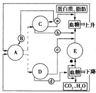 [解析]由题目中模式图结合问题可知,A-E为组织器官,a-d是激素。d的作用是降低血糖,降低血糖的激素只有胰岛素,据此可判断d是胰岛素,D是胰腺,c是胰高血糖素;升高血糖的激素还有肾上腺素等,因此b是肾上腺素,C是肾上腺,b、c都可使血糖升高,故为协同作用。血糖的神经调节与下丘脑有关,据此推断A是下丘脑,下丘脑是体温调节中枢。B是垂体,分泌的催乳素能调控某些动物照顾幼仔。由图可知,血糖浓度上升时,作用于下丘脑,下丘脑通过有关神经作用降低血糖。