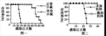 4.以某种胞内寄生的病原体去感染一种基因突变的小鼠后,比较突变小鼠与正常小鼠的死亡情况,结果如图一。感染该病原体后,进行两种小鼠体内T淋巴细胞与B淋巴细胞数目的测试,发现两种小鼠有明显差异;但是在感染前后突变小鼠血清中的免疫球蛋白浓度都非常低。如果用识别该病原体的专一性抗体处理突变小鼠后,再进行感染实验,小鼠存活的结果如图二。则下列推测合理的是( )