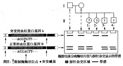 [解析]图示血红蛋白基因的突变是由于碱基A→T,所以该突变属于碱基对的改变。用于检测基因的RNA分子应与检测片段互补配对,因此检测突变基因的探针核苷酸序列为-UGCACAA-。根据凝胶电泳带谱,可以确定:Ⅱ1和Ⅱ4基因型为BB,Ⅱ3基因型为Bb,Ⅱ2基因型为bb,体细胞基因纯合的是Ⅱ1、Ⅱ2和Ⅱ4。正常基因有三个限制酶切点(其中一个位于血红蛋白基因内部),因此基因被限制酶切成两个片段,显示两条带;而突变基因的限制酶酶切点仅位于血红蛋白基因两侧,切割后基因b完整,只能显示一条带。