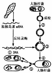 39.1997年,科学家将动物体内的能够合成胰岛素的基因与大肠杆菌的DNA分子重组,并且在大肠杆菌中表达成功。如右图,请据图回答问题。