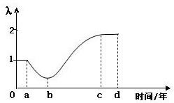 假定当年种群数量是一年前种群数量的λ倍,右图表示λ值随时间的变化曲线。下列相关叙述错误的是