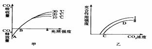 C.乙图中曲线CD段说明在一定范围内,随着CO2浓度的升高,光合作用逐渐加强,Ⅱ曲线所代表的植物体内固定CO2的物质是C3。