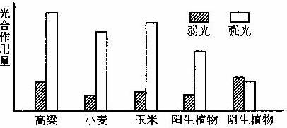 9.在适宜的温度、水分和CO2条件下,分别测定强光和弱光时不同植物的净光合作用量,如图。请据此判断,下列叙述不正确的是: