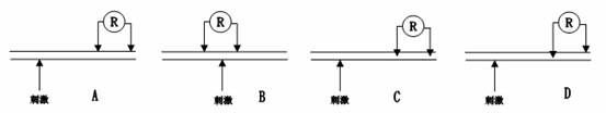 26.用连着微伏表的两个电极测试受刺激后的神经纤维上的电位变化,已知该纤维静息电位为-70mv,如果微伏表上发生一次持续约1ms的电位差的变化:由-70mv上升到0,再继续上升至+40mv,然后再下降恢复到-70mv,则刺激部位和微电极放置位置,正确的是( )。