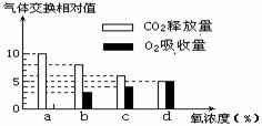 下图表示某植物的非绿色器官在氧浓度为a、b、c、d时,CO2释放量和O2吸收量的变化。下列相关叙述正确的是