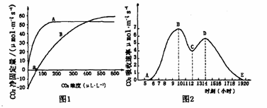 (1)图1表示A、B两种植物在光照等其他条件适宜的情况下,光合作用强度对环境中CO2浓度变化的响应特性。据图判断在CO2浓度为300μL·L-1(接近大气CO2浓度)时,光合作用强度较弱的植物是___________________。
