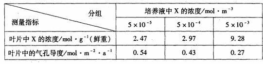 凋节叶片气孔的开闭。他们做了如下实验:从同一植株上剪取大小和生理状态一致的3片叶,分别将叶柄下部浸在不同浓度X的培养液中。一段时间后,测得的有关数据如下表所示。