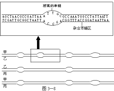11. DNA分子杂交技术可比较不同种生物DNA分子的差异。将来自不同种生物的两条DNA单链进行杂交,两种生物的DNA分子碱基序列越相似,形成的杂合双链区的部位就越多。某人用甲、乙、丙三种生物的DNA单链进行杂交实验,结果示意如图3-8,根据图判断,下列叙述中正确的是 (C)