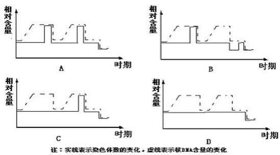 25、(10新野三高月考)下图中虚线表示人体内某器官细胞核中DNA含量的变化曲线,则该过程染色体(用实线表示)数目变化正确的选项是 ( )
