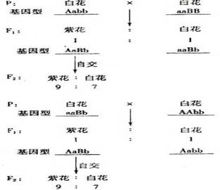 A和a、B和b是分别位于两对染色体上的等位基因,A对a、B对b为显性。基因型不同的两白花植株杂交,F1紫花∶白花=1∶1。若将F1紫花植株自交得F2植株中紫花:白花=9∶7