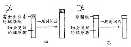 14.(10普宁高三检测)荷兰学者Went于1928年把燕麦胚芽鞘尖端切下,放在琼脂薄片上,约1-2小时后移去胚芽鞘尖端,将琼脂小块放在去顶胚芽鞘一侧,然后置于黑暗条件下培养,胚芽鞘逐渐向放置琼脂小块的对侧弯曲生长。该实验结果不能直接证明的问题是 ( )