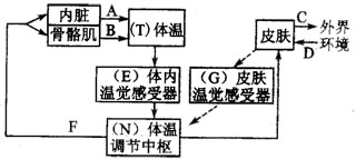 (1)图中T-E-N-F-B途径主要表示______调节过程。B过程主要是通过______作用实现。 (2)在寒冷环境中,人体血液中______(激素)的含量会明显升高,从而加速体温上升。 (3)经测量,某人体温在24h内,都处于39℃,若A、B、C都表示热量,则A+B______C。 (选填“>”“<”或“=”) (4)人体调节体温的主要中枢是在______,该结构还具有调节______等功能