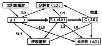 5.右图是某湖泊生态系统能量流动的定量分析图解。图中A.B.C代表三个营养级,数字均为实际测得的能量数,单位为百万千焦,已知该生态系统受到的太阳辐射为118872百万千焦,但其中118761百万千焦的能量未被利用。请回答: