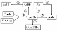 4.(2009年中山一模)下图甲、乙表示水稻两个品种,A、a和B、b表示分别位于两对同源染色体上两对等位基因,?①-⑦?表示培育水稻新品种的过程,则下列叙述错误的是(