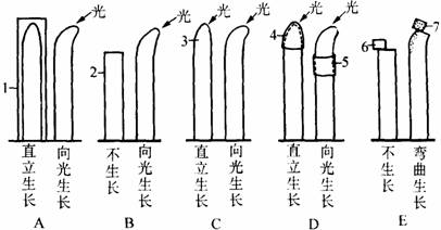 图注:1.不透光罩;2.切去尖端;3.不透水云母片;4.不透光锡纸小帽;5.不透光锡纸筒;6.琼脂块;7.胚芽鞘尖端处理过的琼脂块