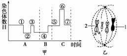 (5)若图甲表示某一个体的发育过程,该个体的基因型为AaBb,两对等位基因独立遗传。则③阶段细胞中的基因组成为________,⑥阶段细胞中的基因组成为________;基因A与a的分离发生在[ ](填数字)阶段。