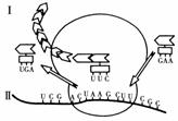 [解析] 题图表示在核糖体上发生的翻译过程,Ⅰ表示合成的肽链,Ⅱ表示翻译蛋白质的直接模板mRNA。由于密码子的简并性,即几个不同的密码子决定同一种氨基酸,mRNA上发生一个碱基的替换,Ⅰ不一定发生改变;此过程中tRNA上的反密码子与mRNA上的密码子互补配对;氨基酸与氨基酸之间通过脱水缩合形成肽键连接在一起,此过程产生水;DNA聚合酶参与DNA的复制过程,不参与翻译过程。