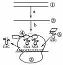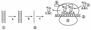 14.(2010年高三期末抽样)如下图表示某DNA片段遗传信息的传递过程,①-⑤表示物质或结构。a、b、c表示生理过程。请据图回答下列问题:(可能用到的密码子:AUC-甲硫氨酸、GCU-丙氨酸、AAG-赖氨酸、UUC-苯丙氨酸、UCU-丝氨酸、UAC-酪氨酸)