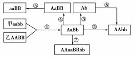 17.(2010年山东青岛3月)下图中,甲、乙表示水稻两个品种,A、a和B、b表示分别位于两对同源染色体上的两对等位基因,①-⑦表示培育水稻新品种的过程,则下列说法错误的是( )