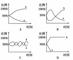 18.(2010年山东德州期末)在某动物种群中,假如基因型为AA的个体占25%,Aa占50%,aa占25%。这三种基因型的个体在某一环境中的生存能力强弱表现为:AA=Aa>aa。下图中比较准确地表示A和a基因在长期的选择过程中比例变化情况的是( )