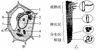 18: 下图甲是植物细胞亚显微结构模式图,图乙是小麦根尖结构模式图,据图回答(括号内填标号,横线上填名称)。
