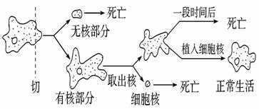 19. 用一根玻璃针,将一个变形虫切成两半,有核的一半能继续生活,无核的一半死亡。如果将一个变形虫的核取出,无核部分能短期生存,但不能繁殖后代,单独的细胞核则无法生存。如果去核后三天,再植入一个细胞核,这个变形虫则生活正常(如下图所示)。根据上述结果回答: