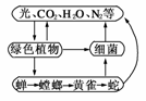 [解析] 本题考查生态系统的概念。题图所示为一个生态系统,由生物成分和非生物成分构成,生物成分包括生产者(绿色植物)、分解者(细菌)和消费者(动物)组成。生产者和消费者之间存在着直接或间接关系,蛇属于四级消费者。