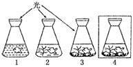 14.(30分)生态系统的成分包括非生物的物质和能量、生产者、消费者和分解者四部分,其中非生物的物质和能量、生产者和分解者在一个生态系统中占有非常重要的地位。为了验证其重要性和不可缺少性,设计如下实验。实验过程如下图所示。在同样形状同样体积的锥形瓶中加等量的水(1、2号加清水,3、4号加少许河泥)、同样的金鱼、等量的金鱼藻(2-4号),用橡胶塞塞紧。1-3号放在阳光下,4号放放黑暗的纸箱中。(均放于室温20℃条件下)