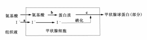 [解析] (1)氨基酸之间脱水缩合形成肽键,在这一过程中,一个氨基酸-COOH中的OH与另一个氨基酸-NH2中的H结合生成H2O,可见H2O中的O来自-COOH。(2)细胞内的碘浓度远远高于组织液中的碘浓度,可见a过程表示的是碘通过主动运输方式从低浓度一侧跨膜运输至另一侧。(3)-(4)甲状腺球蛋白属于分泌蛋白,其在核糖体上合成后,需在内质网中初加工,然后由内质网形成的囊泡包裹着要运输的蛋白质转移至高尔基体,在高尔基体中再加工,形成成熟的蛋白质。