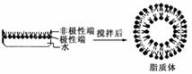实验表明,单层脂分子铺展在水面上,极性端(亲水)与非极性端(疏水)排列是不同的。搅拌后可形成双层脂分子呈球形,如图所示。脂质体是利用磷脂分子可在水相中形成稳定的脂双层膜的特点而制备成的人工膜。