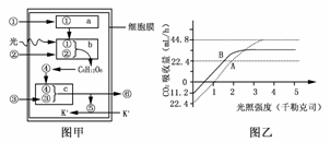 23.(6分)(2010·陕西省西安铁一中高三第二次月考)下图甲表示植物细胞代谢的某些过程,图乙表示光照强度与二氧化碳吸收量的关系。请据图回答问题。(图中数字代表物质,a、b、c代表细胞器)