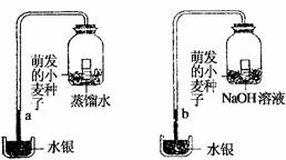 1.如图所示,将等质量的正在萌发的小麦种子,分别放在内有一杯等体积的NaOH溶液或蒸馏水并用塞子塞紧的两个瓶中,各瓶分别与一个水银流体压力计相连接,由此压力计水银柱升高的高度可以测量出某种气体的变化量。开始时两个水银流体压力计的水银柱a、b高度一致。将装置放在适宜的条件下使种子萌发,过一段时间后,会发现a、b高度是