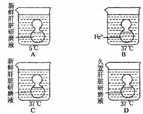 [解析] 本题考查学生的实验能力,考查知识点是酶的催化作用及有关特性。四个装置中,沉入底部的烧瓶最先浮起的是释放气体最多、最快的。解决本题的关键是要看清四个图中所给的条件:装置C中新鲜肝脏研磨液中含有过氧化氢酶,能把过氧化氢分解成水和氧气;装置A中温度低;装置B中是无机催化剂;装置D中是久置的肝脏研磨液,其中的过氧化氢酶已经失去活性。