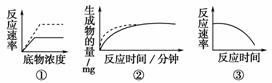 [解析] 在酶量增加一倍时,最大反应速率也增加一倍,可以用图①表示。图②虚线表示反应速度增加而快速达到平衡,可以表示酶浓度增加或换用了催化效率更高的催化剂。图③可以表示随反应时间的延长,底物逐渐消耗、生成物量逐渐增加,导致反应速率越来越慢。